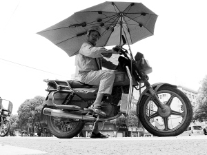 5月14日,一名司机骑着装有遮阳伞的摩托车经过事发地点。近日,网络上出现帖子《湖南衡东交警打人 千人抗议掀翻警车》引发网民极大关注,其中还有网民称,被打的摩托车司机曹敏俊“已经死亡”。新华社“中国网事”记者5月13日赶赴湖南省衡阳市衡东县调查发现,“曹敏俊死亡”属谣言,记者在医院亲眼见到了曹敏俊并与其进行了交谈,曹敏俊对于自己被传言“死亡”感觉“很尴尬”。此外,衡东县纪委、县监察局已经对相关事件进行了调查处理,虽依法执法但作风粗暴的交警部门的相关执法人员受到处罚。 新华社记者 周勉 摄