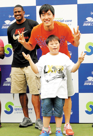 | 14日,刘翔和奥利弗与上海浦东辅读学校的孩子们亲切交流,并分组进行了20米接力跨栏、10米折返跑等游戏。