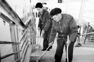 | 图为90多岁的刘应启在扬州火车站做志愿者打扫卫生。新华社发(资料照片) |
