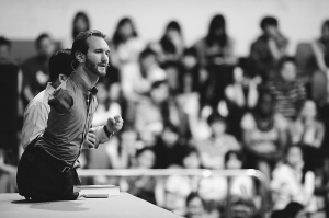 5月16日,澳大利亚残疾人励志演说家尼克·胡哲在武汉中南财经政法大学举办“感恩的心·回馈社会”大型公益讲座,向在场师生传达坚强、自信的理念。 尼克·胡哲是国际公益组织“生命”创办人兼行政总裁,其足迹遍布30多个国家和地区。他天生没有四肢,但是勇于面对身体残障,创造了生命的奇迹。 新华社发(柯皓 摄)