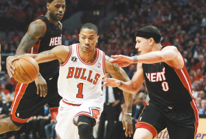 | 北京时间5月16日,公牛队球员罗斯在对阵热火队的比赛中带球进攻。