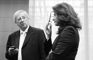 5月16日,国际货币基金组织副总裁妮玛特·沙菲克(右)与欧元集团主席、卢森堡首相让-克洛德·容克在欧元区财长会议期间交谈。欧元区财长当天批准对葡萄牙的援助方案,同意在今后三年中和国际货币基金组织一道向葡萄牙提供780亿欧元的援助贷款。 新华社/路透
