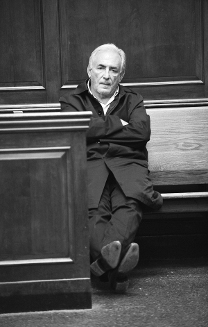 斯特劳斯—卡恩在纽约一家法庭出席听证,身穿深色外套和淡蓝衬衫,面无表情,紧闭嘴唇。