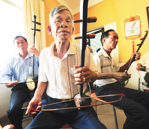 当天前来参加演奏录音的老人有11位,全部来自三亚市吉阳镇安罗村,年纪最大的已经超过70岁。今天演奏的曲目分为婚礼上演奏的喜庆音乐和葬礼上演奏的哀乐两种,加起来有45首,录音时间长达2个多小时。