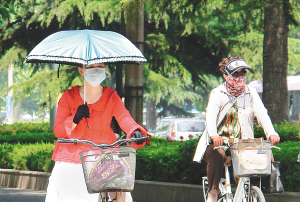5月17日,两名郑州市民冒着高温天气骑行在路上。 当日,郑州市区的气温明显上升,午时达到33摄氏度,为今年入夏以来的最高气温。据气象部门预报,5月17日至18日,河南省大部分地区将出现干热风天气。受此影响,全省极端最高气温可达36摄氏度。 新华社记者 王颂 摄