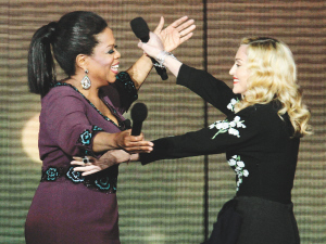5月17日,美国“脱口秀女王”奥普拉·温弗里(左)在芝加哥联合中心录制节目时拥抱歌手麦当娜。 当日,奥普拉“脱口秀”倒数第三场节目在联合中心录制,包括汤姆·汉克斯、麦当娜、汤姆·克鲁斯、哈莉·巴里在内的众多明星参加此次节目。素有“脱口秀女王”之称的奥普拉·温弗里已经和她的脱口秀节目走过了25年的历程。 新华社发