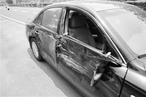 | 被撞的采访车。 本报记者 李英挺 摄 |