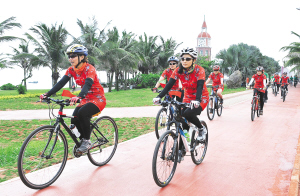 5月19日,2011海南省“中国旅游日”暨海口绿色慢行休闲系统活动启动仪式在海口西海岸举行。图为自行车爱好者在西海岸新建好的100公里长的绿道上骑行。 本报记者 王凯 摄