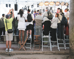 ←影迷自备梯子围观戛纳海边的一场关于电影节的电视直播节目。