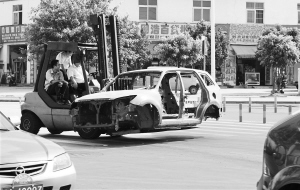 5月18日下午,一辆装卸专用铲车“叼”着一个小轿车车壳,在海口市金盘路上狂奔。原本只能乘坐一名驾驶员的操作室里,挤着三名大汉。路人和车辆见状纷纷躲闪,同时也为这三位“勇士”的玩命行为捏着一把汗。 “太不像话了,这种车怎么能开到大街上来?”“自己不要命也应该考虑别人的安全啊?”“铲车上铲着的车壳没有任何捆绑,掉下怎么办?”在金盘路上,一些市民抱怨道。 据了解,去年3月,一辆同样的铲车从附近一家工厂开出来时,遇到一辆正常行驶的小车,由于铲车刹车系统反应滞后,前面的铲子插进小车后座,幸好小车后座上没有乘客,小车司机和铲车驾驶者都不同程度受伤。 本报记者 古月 摄 |