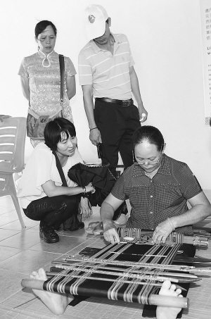 | → 5月18日,职工代表在三亚槟榔河文化旅游区参观织黎锦。本报记者 宋国强 摄 |
