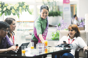 | 三亚银泰酒店的“中国旅游日活动大使”龙琴给俄罗斯游客上迎宾茶。 本报记者 苏建强 摄 |