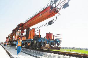 5月19日,一台大型起重机在工人的操作下铺轨架梁。当日,福建向莆铁路莆田特大桥的铺轨架梁工作全面展开。该桥是向莆铁路的控制性工程,也是向莆铁路福建段最长的桥,总长16.99公里,横跨木兰溪等38条河流。 国家重点工程向莆铁路西起江西南昌向塘,东至福建莆田,正线全长约603.6公里,总投资518亿元,于2008年11月全面开工。 新华社发(林剑冰 摄)