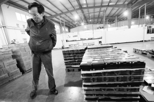 浙江海久电池股份有限公司副总经理赵国根站在公司车间内的蓄电池产品边(资料照片)。 新华社发