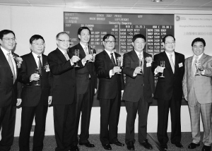 5月20日,上海医药集团股份有限公司董事长兼执行董事吕明方(左四)和嘉宾在上市仪式上举杯祝酒。当日,上海医药集团股份有限公司在香港交易所主板成功挂牌上市。 新华社记者 黄本强 摄