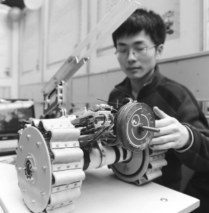 5月21日,学生在展示仿蠍形变形履带机器人。 当日,哈尔滨工程大学举办第十七届“五四杯”大学生科技创新竞赛,来自该学校各院系的464件科技发明制作类作品在此次竞赛上展出。其中,能够在大型公园、广场和体育场馆使用的两轮自平衡小车、仿蠍形变形履带机器人等发明制作引人瞩目。 新华社记者 王松 摄