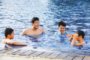 今天是男篮来海南封闭集训期间安排的媒体开放日。记者下午来到西海岸温泉度假酒店时,看到有的队员们穿着泳装走回房间,有的队员正在温泉泳池里戏水。看起来,他们又度过了悠闲的一天。事实大相径庭,一问,原来是艰苦的训练后,全队来到泳池进行短暂的放松调整。