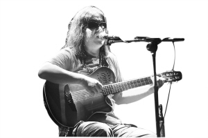 5月21日的晚上,海南师范大学的音乐厅里,一个魁梧粗壮的男人,顶着一头披肩长发,脸上架着一副宽大的墨镜,手里抱着一把吉他,一个人,在舞台上悠然自得地弹唱着。