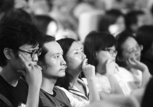 | 图为海南师范大学的学生专注倾听周云蓬弹唱。 |