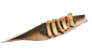山捞叶炸排骨,就是先将排骨与保亭随处可见的野菜———捞叶一起腌制,让捞叶的清香浸入排骨之中,再下锅煎炸,最后排摆在椰子叶上,一道菜融合了排骨、捞叶和椰子三种香气,不用吃在嘴里,但是看一看,闻一闻,已让人食指大动。
