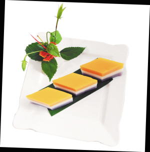 大鱼大肉吃得多了,也该上点主食和青菜了。黎苗三色糕,顾名思义,是三种颜色、三种原料、三种味道,晶莹剔透,煞是好看。一口咬下去,椰子、芒果、紫薯的味道混溶在一起,别有一番滋味。其实说起来,三色糕还是从苗族三色饭中得到的灵感。