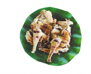 而保亭当地最传统的做法,则是将什玲鸡洗剥干净后,除了盐巴什么佐料都不加,直接放到炭火上烤,这种简单的制作方法却最能保留鸡肉原始的味道。因此不仅成为各家农乐乐的招牌菜,更得到君澜酒店餐饮总监谢明的推崇,“有些厨师认为加点盐就上火烤,这怎么能登堂入室呢?殊不知这才是黎苗美食的精华所在。”