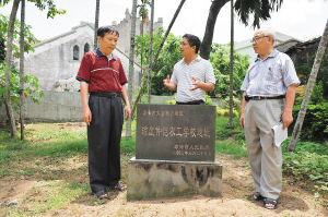 | 琼崖仲恺农工学校遗址前,嘉积中学负责人正在和该市的党史工作者商量,如何把校园里这块宝贵的红色遗址打造成学生们继承革命传统的教育基地。 本报记者 王凯 摄 |
