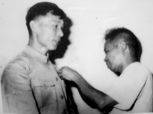 | 越南工作人员为林秉坤佩带友谊徽章。 |