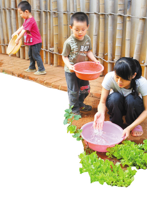| 在家庭互助教育室前,老师与孩子们给菜地浇水。 |