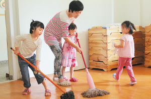 | 拖地板也是孩子们的学习内容。 |