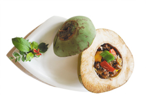 保亭椰子鸡和竹筒鸡,就是以这种土鸡为原料,经过现代烹饪手段加工制作而成的美味佳肴,但保留了其中的黎苗特色,分别以椰子和竹筒作为盛具,菜肴中平添了一股椰子的甘醇和竹子的清香。