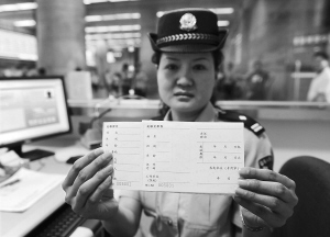 5月22日,北京西客站的公安制证窗口,工作人员展示为旅客补办临时身份证明。 6月1日起,北京铁路局实行动车购票、乘车实名制。5月22日下午3时开始,北京的火车站开始预售6月1日动车组列车车票。