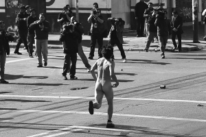 5月21日,一名抗议者在智利瓦尔帕莱索国会大厦外裸奔。当天,智利总统皮涅拉在瓦尔帕莱索国会大厦发表上任以来第二份国情咨文。与此同时,数千民众在国会大厦外组织示威游行并与治安警察发生冲突。 新华社/路透