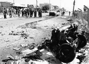 5月23日,一辆汽车在伊拉克北部城市基尔库克发生的汽车炸弹爆炸事件中被毁。 当日,基尔库克发生一起汽车炸弹爆炸事件,造成2人死亡、14人受伤。 新华社/路透