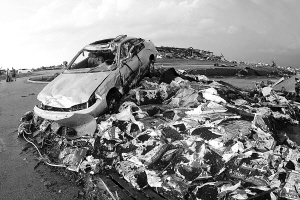 | 5月22日,一辆轿车在美国密苏里州乔普林市遭遇的龙卷风袭击中被破坏。