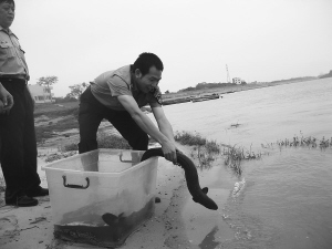 本报海口5月23日讯 (记者侯小健 通迅员蔡筱丹)今天下午,省海洋与渔业监察总队在南渡江海口段放生6只硕大的国家Ⅱ级野生保护动物活体花鳗鲡,这些花鳗鲡是该队近日在部分酒店查获的。