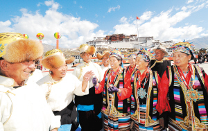 5月23日,拉萨各族各界5000人聚集在布达拉宫广场,举行升国旗唱国歌、为“西藏和平解放纪念碑”敬献花篮仪式,庆祝西藏和平解放60周年。