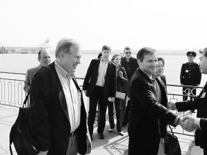 5月24日,美国国务院负责朝鲜人权事务的特别代表罗伯特·金(前左)以及美国国际开发署负责对外灾难援助的助理署长乔恩·布劳斯(前右)一行抵达平壤访问。 罗伯特·金一行将实地考察朝鲜的粮食需求并将同朝鲜官员会面。他们将于28日结束访问。 新华社记者 张利 摄