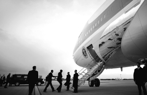 5月23日,美国总统奥巴马(前左二)和夫人米歇尔(前左三)在爱尔兰首都都柏林登上“空军一号”专机。 由于担心冰岛火山灰云可能到达英国部分地区,美国总统奥巴马23日晚提前结束对爱尔兰的访问于当晚飞往英国,继续进行欧洲之行。 新华社/法新