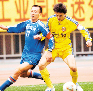 | 曾经在中超赛场上的赵家林(左)一直是球队的“主角”。 新华社发 |