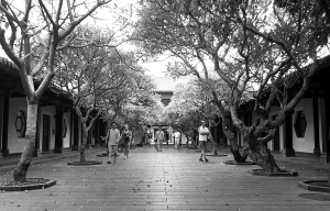 穿过府城熙熙攘攘的街道,琼台书院闹中取静,粉色、黄色的鸡蛋花撒落一地,细雨温润,空气中透着淡淡花香。