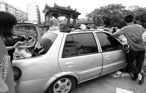 5月24日下午,在海口市红城湖路上,一名小商贩在自己的私家小轿车上摆起摊点卖衣服鞋袜等物品,吸引了不少市民。随着私家车的普及,一些摊贩“鸟枪换炮”,将摊点从地上“搬到”车身上,试图打擦边球逃避城管的执法。 本报记者 张杰 摄