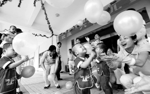 5月24日,“六一”国际儿童节前夕,南山景区部分团员来到三亚市社会福利院,给30余名孤残儿童送来了奶粉、糖果、饼干、玩具等用品,并和孩子们一起做游戏。 本报记者 苏建强 特约记者 陈文武 摄