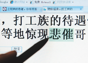 “悲催”是当前的网络红词,字面意思是悲惨得催人泪下。上海一位网民不久前在天涯杂谈上发表了“北京上海广州等地惊现悲催哥”的帖子。网帖中说,一个来自江西农村的大学毕业生“悲催哥”,在上海谋生艰难,拿的是最低生活保障工资,每月1120元,低于上海一般工薪阶层月收入约2000元的标准。