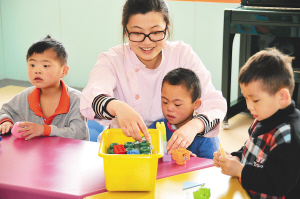 5月25日,济南市儿童福利院的工作人员在照看孤残儿童。 经过两年多的建设和筹备,济南市建成了具有全国一流水平的儿童福利院———济南市儿童福利院。该儿童福利院占地8.2公顷,建筑面积3.5万平方米,设计床位1000张,总投资达到1.45亿元。目前已经有300余名孤残儿童入住这个新家。 新华社发