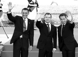 八国集团首脑会议26日在法国西北部海滨小城多维尔开幕。根据会议议程,与会首脑将就阿拉伯国家局势、非洲发展和互联网三大主题展开交流磋商。 图为5月26日,在法国西北海滨小城多维尔,法国总统萨科齐(右)欢迎美国总统奥巴马(左)和俄罗斯总统梅德韦杰夫。 新华社发