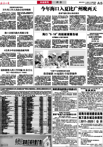 海南日报 本省新闻社会 005 2011-05-271 2011年05月27日 星期五