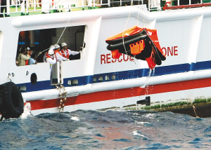 | 5月27日上午9时10分,在三亚以西海域,“南海救115”轮靠近漂移的橡皮筏,准备实施救助。