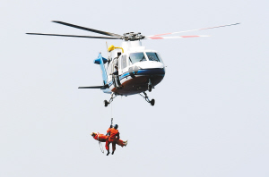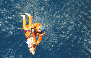 | 5月27日上午10时06分,专业救助直升机B7303对在海上搜救到的模型人开展绞车作业实施救助。