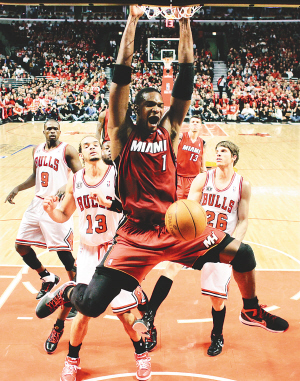 5月26日,热火队在2010-2011赛季NBA东部决赛第五场比赛中,以83:80战胜公牛队,以总比分4:1晋级总决赛。 图为热火队球员波什(中)在比赛中扣篮。 新华社发